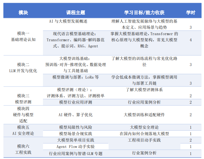 | 模块四硬件与模型适配 | AI 硬件、算子优化 | 大模型训练和适配硬件 | 2 |