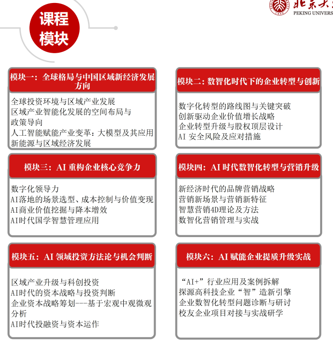| 模块六:AI 赋能企业提质升级实战 | “AI+” 行业应用及案例拆解探源高科技企业 “智” 造新引擎企业数智化转型问题诊断与研讨校友企业项目对接与实战研学 |
