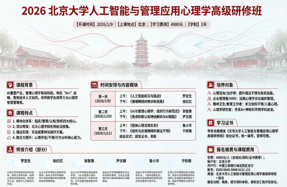 在人工智能技术重塑全球产业格局的浪潮中,管理应用心理学已成为组织效能提升的核心驱动力。当前,数字经济与实体经济深度融合的战略需求,对管理者提出了更高要求 —— 既要驾驭 AI 工具实现业务创新,又需洞察人性规律激发团队潜能。本研修班响应 “人工智能 +” 国家战略,聚焦技术赋能与人文管理的协同创新,旨在培养兼具数字化领导力与心理学智慧的新时代管理者。