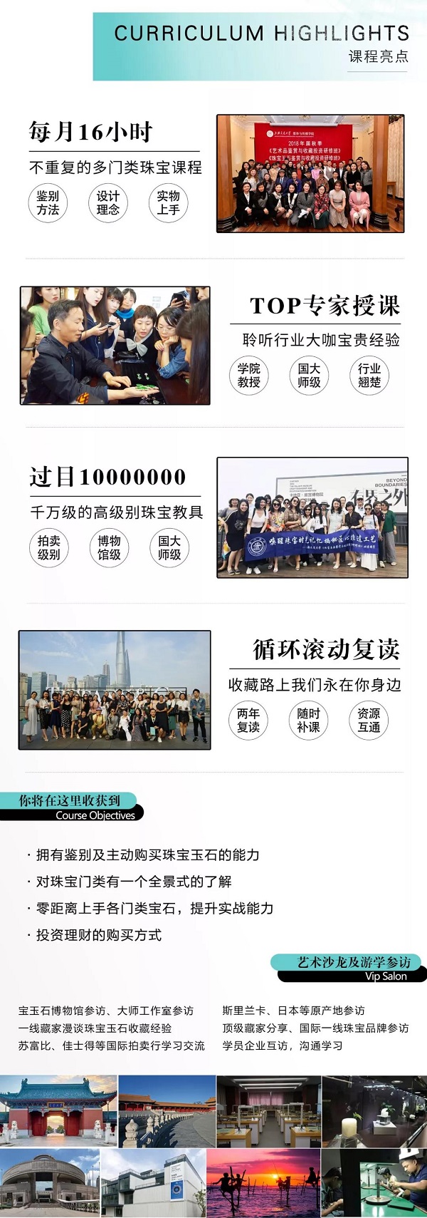 另外,同学们在交大珠宝班的课堂里,能够接触到藏家手中的顶级珠宝玉石,并有机会与国内外知名拍卖行做直面交流,拓展视野,提升审美品位。
