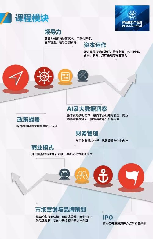 精准医疗产业精英研修班第二期课程将于2019年3月正式开课,通过权威师资、系统学习、实战演练、长期交流四位一体的方式,旨在帮助医疗健康领域创业者提高创业成功率,加快企业健康成长,助推医疗产业的高速发展。